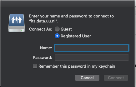 You should now see a credentials dialogue box. The “Connect as” setting should be set to “Registered user”. “Name” should be your email address.